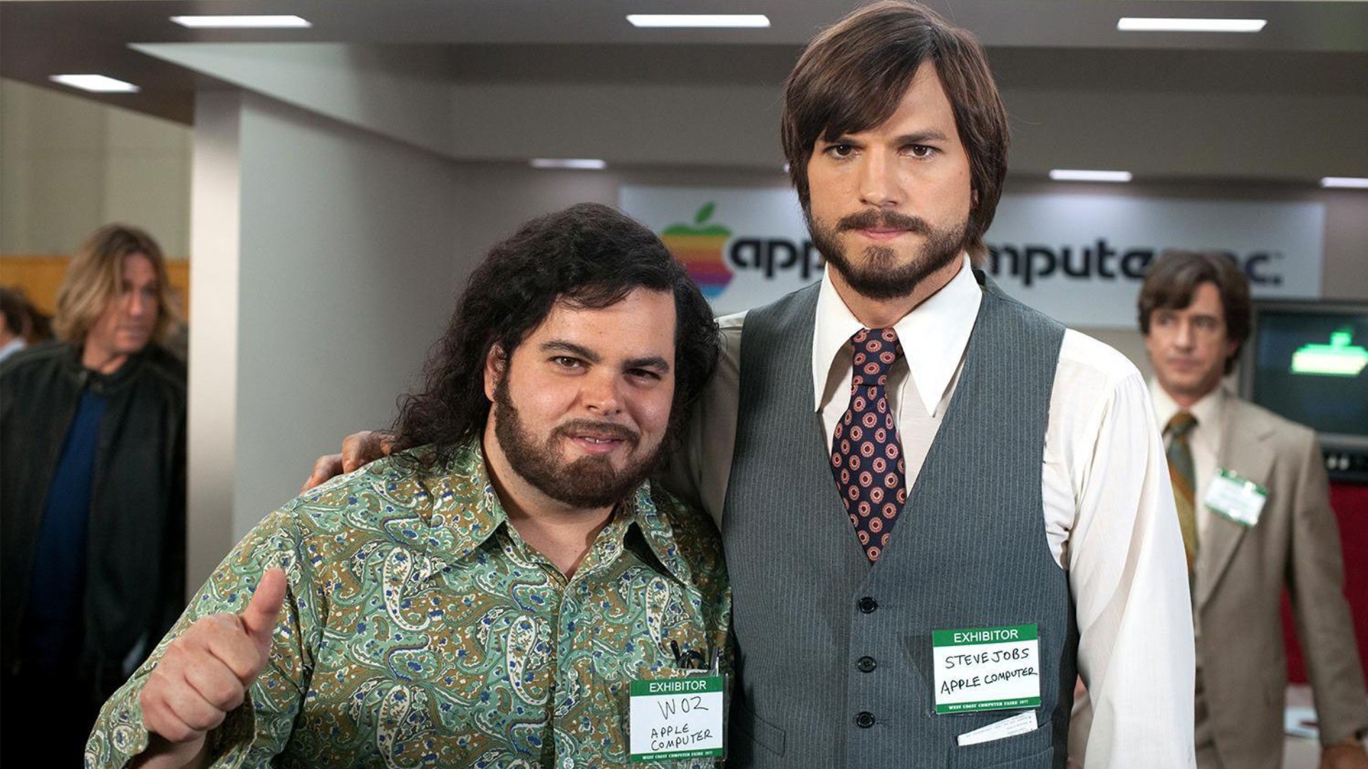 The film opens in 2001 with a middle-aged Steve Jobs (Ashton Kutcher) introducing the iPod at an Apple Town Hall meeting.