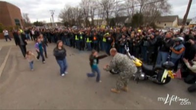 A Harley-loving soldier surprises his four daughters by returning early from Afghanistan and leading a parade of 400 motorcycles right to their school's front door.