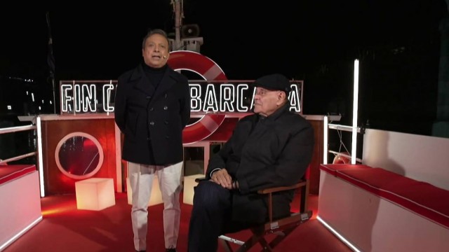 Clemente Mastella dialoga con Piero Chiambretti su una barca che naviga sul fiume Tevere, nel cuore di Roma.
