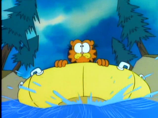 Garfield landet auf einem Gummiboot und saust damit ein Wildwasser hinunter. Als er schließlich wieder von Jon in die Arme geschlossen wird, muss er bei ihm als Ersatzkaninchen fungieren.