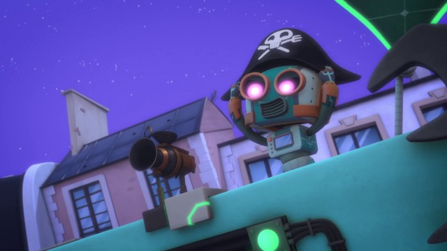 An over-eager Ice Cub tries to serve justice to Pirate Robot with his ice powers, but Pirate Robot easily evades him.