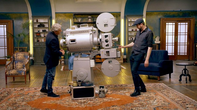 Nigel Havers presides as five sellers aim for the best price for their items, including a toy aeroplane, a projector, camping kitchen, a wardrobe and collection of red glassware.
